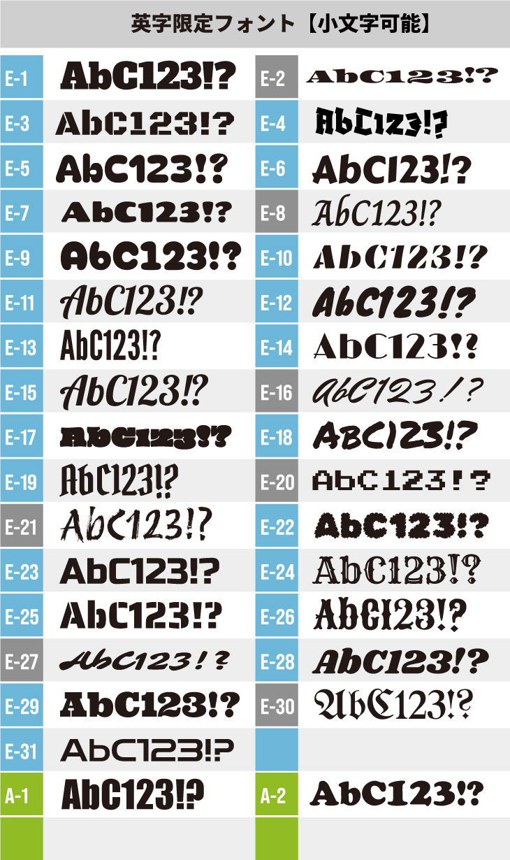 自身でデザインデータを用意出来ない場合、コチラでデータ作成をする事が可能です。文字部分は以下のフォントでご指定いただく他にも、ネットで探していただいたフリーフォントをご指定いただく事も可能です。