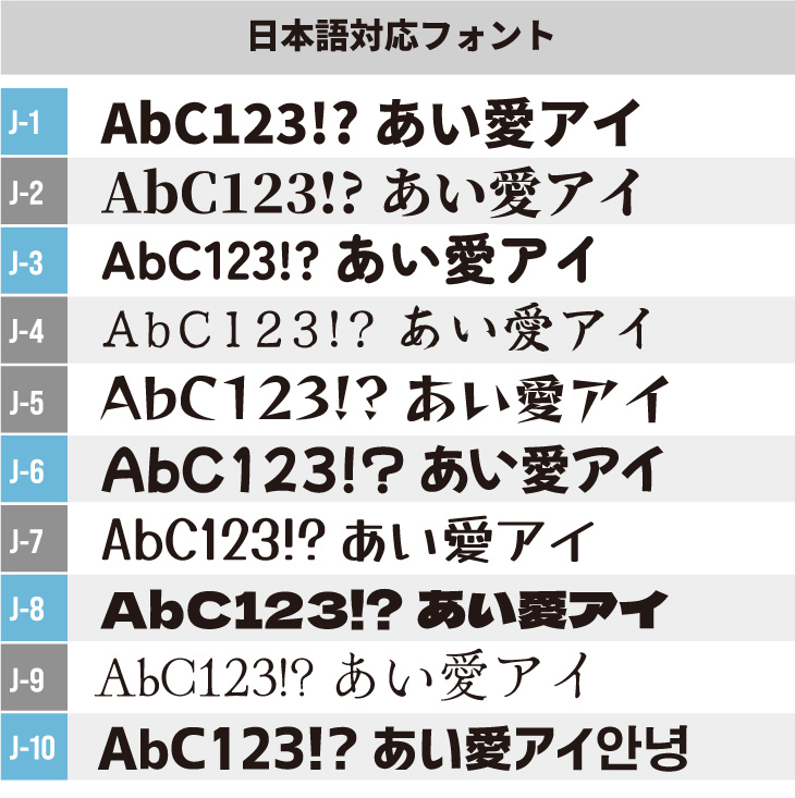 自身でデザインデータを用意出来ない場合、コチラでデータ作成をする事が可能です。文字部分は以下のフォントでご指定いただく他にも、ネットで探していただいたフリーフォントをご指定いただく事も可能です。